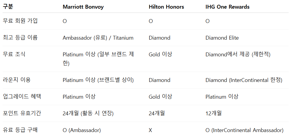 각 호텔 브랜드마다 포인트 적립률, 등급 기준, 혜택이 다르다. 아래는 세 가지 브랜드의 멤버십 구조를 비교하고 함께 자세한 설명을 덧붙인다.